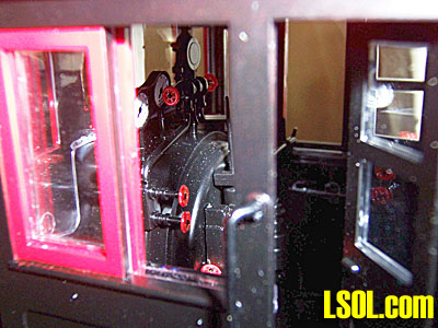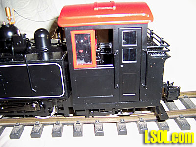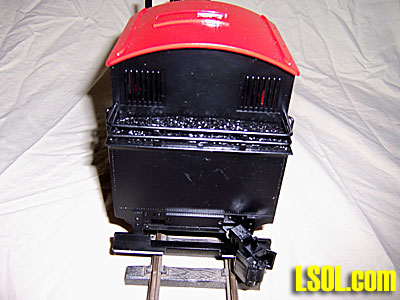 These are somewhat limited views of the cab interior and backhead details. The detail matches that found on the Anniversary 10-Wheeler Big Haulers. A little difficult to see with the all weather cab but the detail is there. The locomotive comes with a factory installed and wired speaker. The speaker is mounted in the coal bunker. The speaker grill is the back wall of the cab. Wires from the speaker are plugged in to the main circuit board. To gain access to the speaker four screws are removed from the bottom of the cab floor. With the screws removed the cab may be lifted off to gain access.  A view of the back of the locomotive. There are vertical bars over the rear windows. They keep coal from breaking the back cab glass. Of note in this picture is the rear coupler swing. I put the coupler at its extreme swing to show it has a full range of motion from one side of the engine to the other. There should be no problem pulling cars off the track even on 2 foot radius curves. For those who desire a coupler that sets closer to the rear of the engine there is a shorter shank coupler that can replace the coupler attached on the locomotive as delivered.