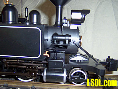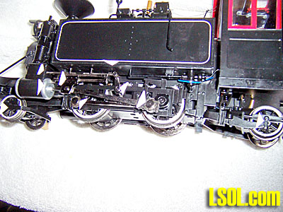 Mounted on top of the left side tank is a transfer pump. Two views are provided. The pump is highly detailed. The steam cylinder has a steam line running from the cab. There is a steam exhaust that runs part way down the side of the tank. The pump has a line that enters the top of the water tank. There is no provision supplied for a water discharge from the pump for either drafting or for water pressure to fight fires, etc. Adding a discharge line would be an easy addition.  This is a look at the drivers, rods, steam chest with lubricator line. The engine is equipped with Stephenson valve gear.. The steam chest has a working metal valve stem driven by a metal rocker arm. The arm is attached to eccentrics mounted on the front drive axle. Crosshead and crosshead guide is metal. Note that the engine is outside frame with driver counter weights mounted on the drivers. All parts are metal with the exception of the outside frames that are plastic. These outside frames are more substantial and highly detailed when compared to the 1994 version of the locomotive. Note the water injector line with regulator is running from the bottom of the tank to the cab. There is an injector line on each tank.