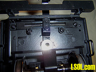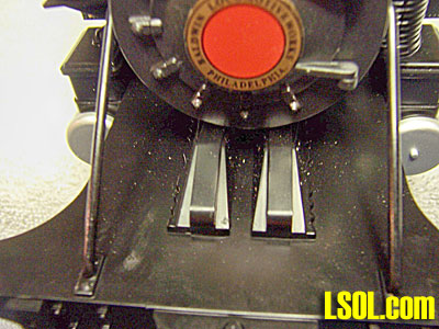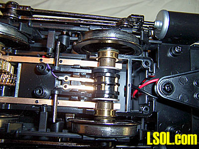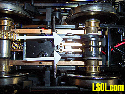 The motor block cover is held in place with six screws. When removing these screws note that the back two screws are longer than those in the middle and front. These longer screws have to go back in their rear position in order to properly secure the cover. Note that the gear case is exposed. The gears are metal. If the bottom cover is removed then take the opportunity to add a little gear lube to the gear case. As received the gear case was well lubricated. Any good gear lube will work. I prefer Super Lube manufactured by Synco of Bohemia, NY. For oil on any part of a locomotive I use Bachmann EZ Lube Light Gear Oil. The motor block case is plastic. Note there are brass bushings, with shoulders, that set in the case to support the axles. When replacing the bottom cover make certain these brass bushings have stayed in place to properly support the drive axles.  This is the front axle. Note the sound drum in the middle of the axle. It has four contacts so the engine will give four chuffs per driver revolution. You can also see the brass contacts that rub on the sound drum. They are attached with wires to the main circuit board.
