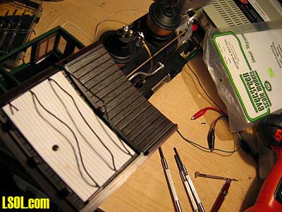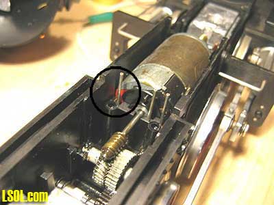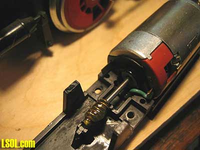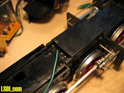 Well, I have just completed installing an Aristo-Craft 75 Mhz on-board receiver (CRE55491) into my LGB 2-6-0 Mogul. It was an interesting project, so I thought I would write a quick article explaining my approach to the installation. I decided to go with the Aristo on-board control for several reasons. One of those reasons being that the Aristo-Craft TE transmitter cost is less than others and I wanted to have 3 transmitters on my layout so that my nieces kids can come over and each control a train. And of course, I need a transmitter so I can hit Emergency Stop when needed! :) So, like any fun project, I was off to the Hobby Shop to pick up the 75 Mhz TE transmitter and on-board receiver. While there, I also picked up the Aristo-Craft Elite 22 volt 13 amps (CRE55464) power supply. Ya gotta love walking into the Hobby Shop! Next was the project itself. I quickly decided that the garage was too HOT for this project, so I decided to work on the family room bar (Debbie wasn't real happy, but she's a great sport when it comes to my train obsession). Here is the proper Tucson summer time model train-working environment: INSIDE with Air Conditioning. :) Here is the approach I took to disassemble the LGB Mogul: Remove the Engine Cabin Roof (1 screw in back and 2 in front). Remove the Cabin Boiler structure (4 screws under the Cabin). There are plastic cylinders glued directly underneath the cabin and I had to remove those also. The glue was soft, so I just wiggled the cylinders off. As seen in the next photo the LGB engine control Printed Circuit Board (PCB) is exposed. You can also see where several years ago I had added 2 LEDs to light up the cabin: one is a red LED (that glows through holes I had drilled in the boiler door) and the second is a bright white LED that shines up into the face of Engineer "Bob"!  Slide the (green) cabin structure back away from the boiler as seen in the photo below (there are brass rods that run the length of the boiler and will slide out of the holding stanchions. You can remove the brass rods as they are only pressed into the plastic cabin structure. The LGB engine control printed circuit board will have 4 wires (brown and black for the front head light, white and black for the smoke unit) running to the front of the engine. There is a ribbon cable with 3 wires (white, brown green) coming from underneath the circuit board and running to the plastic engine block. Remove the Engine Boiler (remove 2 very small screws underneath and disconnect or unplug the two brass rods connecting the boiler to the front cattle guard)  CLICK FOR LARGE PICTURE As seen in the picture below, all of the wiring is exposed (the circuit board sitting on top of the note book is the 75 Mhz on-board receiver).  With an ohmmeter I discovered that LGB wired one of the track power pickup leads to one of the motor leads. That is why there are only 3 wires coming from the plastic motor block unit instead of the 4 wires, which I had expected. The Aristo on-board receiver REQUIRES that you have 2 wires for track power pickup (or battery power) and 2 wires for the motor drive. They CANNOT be connected in any way. The motor and track power must be isolated. Aristo says the on-board receiver would be damaged if we keep the common motor and track power lead. So, I had to go into the motor block and see if I could separate the common motor and track power connection. Remove the top of the Motor Block (remove 4 long screws and 2 smaller screws. The smaller screws attach to lead weights in the Motor Block) The photo below shows the Motor Block with the top off uncovering the motor, connection posts, and gears. Notice the RED tab on the motor to the left side of the picture (if this is not in color it is the left side of the motor next to the single connection post). That single connection post is our problem child because it connects the port side track power and motor together (port: is left side as viewed from the train engineer looking into the cabin looking forward). This is a physical contact connection made by the motor resting on the post, not a wire that we can cut and splice into. My solution was to remove the motor (simply pull the motor up and out from the plastic motor block housing), bend the port side (red tab) motor contact in half so that it would not make contact with the wiring post and then solder a wire to that bent motor contact as seen here. Make sure that you have bent or cut the motor contact short enough so that it does not touch the port side motor block contact post.  I then drilled a small hole in the motor block cover and ran my wire (green) out the top through the hole.