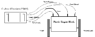 Here is the motor block cover sitting upside down with the wire pulled through the hole and the motor sitting in place. I then installed the motor block cover and motor back in place all at one time. Putting the motor in place and then trying to install the motor block cover did not work for me. The wire kept getting in the way of the installation. This picture shows the reassembled motor block with the new green wire, which is attached to the port side motor connection.  Now I can wire the motor and track power independently to the On-board Receiver. Below is the description of how to connect the on-board receiver and the motor block. - Track Power: I connected the port side track-power (which is the existing motor block post that we just isolated) to the Red, wire #7 called "Left Side Track Power Pick-up" in the manual. Then connected the starboard side track-power to the Black, wire #1 called "Right Side Track Power Pick-up". - Motor: I connected the new Green wire coming out of the motor block (which is our port side motor connection) to the Orange, wire #6 called "Left Side Motor Terminal". Then connected the starboard side motor to the Grey, wire#2 called "Right Side Motor Terminal".  CLICK FOR LARGE PICTURE Lights: I would recommend that you go to the Aristo-Craft web site and download the TE manual if you are going to connect lights to the on-board receiver. The manual on the web page is called "Updated Instruction Manual for On-Board Train Engineer - CRE-55492" and once downloaded it's called "te75manual.PDF". (The 55492 is Aristo's 55003 TE Transmitter and 55491 On-board Receiver packaged together). The small manual supplied with the receiver has a totally different way to connect the lights with diodes. That method not only does not work, but it is more difficult to wire. The PDF manual has the proper light installation solution. Just connect the lights to the front and rear light connections (if LEDs include a series 1K ohm resistor for each LED) with the returns connected to the "common" wire. No diodes, no cutting into track power. I left the original LGB printed circuit board (PCB) in the cabin to control all the LED lights and smoke device. There is a switch at the rear of the Mogul with three positions. Position (1) turns everything off (ie. no motor, no lights, no smoke), (2) turns on motor and lights with no smoke, (3) turns on motor, lights and smoke. When the smoke element is turned on, with switch position 3, the LGB PCB gets rather warm. Since my on-board receiver was going to be positioned on top of this board (as seen in the next photo.) I did not want all the heat, so I moved the switch to position number 2 (motor, lights, no smoke). I will turn to switch position 3 when I want smoke, but I usually run without smoke anyway.  Red Push Button: There is a push-button switch required for programming the 55491 receivers. It is supplied with a connector for easy removal, but it stands up rather high. In order to get the on-board receiver in to the Moguls boiler area I had to cut the connector from the push-button and solder the wires directly to the receiver's circuit board. It is a snug fit. Programming Lights: Since I did not use the receiver to control the engines lights I needed to connect a light to one (front or rear) of the on-board receiver light controls. The receiver is setup to blink the train lights during programming. So connected a yellow LED with a 1 K ohm resistor to the "Rear Headlight" control and the "common" of the receiver. That way, I could see the blinking rate of the LED while programming, it would not be on while the engine is moving forward and when it came on while moving backward it would be a low intensity light and look nice. Antenna: Wiring the antenna was another interesting effort. You do not want the wires of the antenna to cross over top of each other or you effectively shorten the antenna's receive wavelength, which in turn reduces your reception capabilities. Hence, you will have to be closer to the engine than normal. So I cut a piece of styrene to wrap the antenna wire around (staggered with out crossing over itself) and mount to the roof of the engine cabin. Figure 10 shows the notches I cut and how I wrapped the wire. I also made sure that the wire leading from the boiler to the antenna did not cross. This arrangement seems to work pretty well. With the TE transmitter antenna in the collapsed position I can control the engine at about 30 feet. With the antenna pulled out, I can control the engine from all over my yard, which the longest run is about 90 feet. I have ordered some small 75 Mhz antennas from www.ecubedrc.com for $10 each. These new antennas boast some very good reception numbers and are only 3 inches long. When I get one installed I will let you all know how they work out.  Well, that pretty much wraps up my LGB Mogul on-board receiver project. It's always fun digging into the guts of these train products and seeing how they are constructed. LGB seems to be Tops when it comes to a quality design. Top of Page