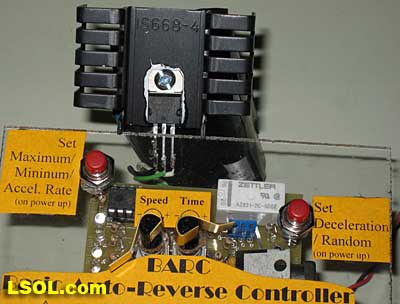 The finished unit is pictured below. You can see the 4 LEDs on the left (2 are illuminated here), the two switches are the red devices labeled Set Maximum and Set Deceleration/Random and the two potentiometers are labeled Speed and Time. The circuit board and electronic components are also visible through the clear plastic mounting stand. The microprocessor is the black rectangle in the upper left corner. The white object in the upper right corner is the reversing relay. On top of it is the power transistor that controls the train's speed. The unit also has a name, BARC - the Basic Auto-Reverse Controller.