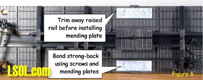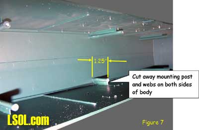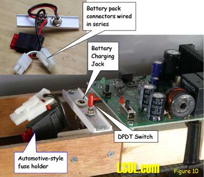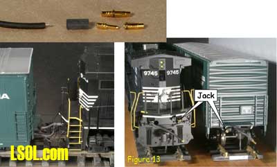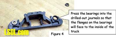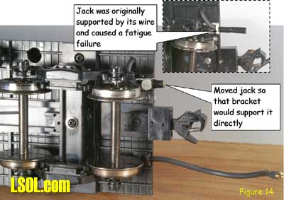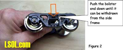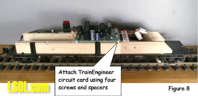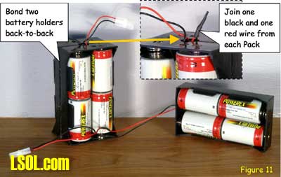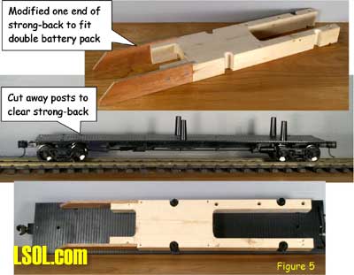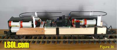 Although track power is still the predominant method for powering and controlling garden railway trains, battery powered radio control is gaining in popularity. One means of setting up such a system is to put the radio control receiver and batteries in a car that will trail the engine. This allows the use of large capacity batteries for longer run times between charges and a single trailing car can be used with several different locomotives. This article is for those modelers who want to give battery-powered radio control a try. Because there are all sorts of options for building a radio control / battery car, I will show you how I did mine so that you will have enough information to build yours. Rather than trying to exactly copy what I've done, consider what might work best for you and try experimenting. Because I model modern standard gauge trains in 1:29 scale, I chose to use an Aristo-Craft Evans boxcar. Before starting work, I listed the features I wanted to have in my radio control / battery car. They were: Long Run Time - I wanted long run times with up to two Aristo-Craft Dash 9 diesels and chose nickel metal hydride (NiMH) batteries because they have excellent power density. An Internet search turned up some 11,000 milliamp hour D cell batteries. Twelve cells yielded 14.4 volts, allowing a medium operating engine speed, appropriate for a small, regional railroad. For high-speed inter-modal freights or passenger trains, you might want to consider using 16 cells for 19.2 volts. Easy Access - The car had to be easy to get into to access the power switch, fuses and charging jack. I chose to mount all of the equipment to the chassis of the car and have the box simply lift off. Control More than One Locomotive - The radio control receiver had to handle the current draw of at least two Aristo-Craft Dash 9 Diesels with the possibility of adding more similar size locos later. I chose to go with the Aristo-Craft Trackside Train Engineer receiver (CRE55471) that can control up to 10 amps. The TE is widely available and competitively priced. There are other radio control systems which can handle 10 amps and any one of them could be substituted in this project. Before installing the radio control receiver and batteries, the car had to be prepared by adding ball bearings to the trucks, stiffening the chassis and creating clearances in the box car body. I recommend that you install bearings in the trucks because a car filled with batteries can be quite heavy. The wheel axles are steel and they run in bronze bushings in the truck side frames. These friction bearings will cause drag and wear quickly. The very first thing I did was to install Aristo-Craft #29411 Ball Bearings. My car came equipped with metal wheels, but the newer Evans boxcars are being shipped with plastic wheels that should be exchanged for metal replacement wheels. To install the ball bearings I disassembled each truck. I popped all of the rotating caps off of the axels as shown here Then using a jeweler's screwdriver I took the springs out of one side of the truck. Although I took my chances, some modelers like to tie a bit of thread to each spring before removing it to keep it from flying away. Once the springs were safely out, I slid the bolster down and pulled it out of the side frame as shown here I removed the wheel sets and pressed the bronze bushings out of the side frames as shown here. The factory apparently puts a bit of glue on the bronze bushings and I sometimes needed to grab the flanges with pliers and twist gently to first break the bond. Then, I drilled the bushing holes to fit the ball bearings. The bearings have an outside diameter of 6 millimeters. If you do not have a 6mm drill, a 15/64" diameter bit is very close. Be gentle with your drilling. I used a drill chuck from my lathe's tailstock to let me drill by hand. You should be able to press the bearings in with gentle pressure. If they resist, use the drill bit to open the tight hole(s) until you achieve a good fit. The trucks were now reassembled by reversing the disassembly process. The bearings made a remarkable reduction in rolling resistance. Be careful where you put your finished car down. If the surface is not really level, your car will disappear over an edge. The next step is to modify the car's chassis. I always body mount Kadee #789 couplers on my cars and I did this with my radio control / battery car. Whether to make such a conversion is a matter of personal preference and this conversion will work just fine by keeping the factory-installed truck-mounted couplers. The next step and the key chassis modification is to stiffen the floor. The floor platform is very limber and relies on being screwed to the box car body for stiffness. Since I plan to lift the boxcar body off frequently and did not want to remove and reinstall screws each time, I needed to find another means to stiffen the chassis. First, I removed the box car body from the chassis by removing the six screws that held it in place. Then, I measured the chassis and chose to cut a stiffener from a piece of 2 X 4 lumber. The stiffener could have been some other material such as aluminum angle irons. However, in order to avoid interfering with the radio control receiver antenna, I chose to avoid any sort of metal and used wood. Take a look above at the stiffener, the chassis modifications to accommodate the stiffener and how they looked when mated. In order to secure the stiffener, I drilled up through the floor and secured it with screws. To keep the screw heads from pulling up through the soft plastic floor, it is necessary to use washers or a mending plates as shown here. The raised under-floor ribs have to be trimmed flush with the floor before installing the mending plates. I found my mending plates in a hardware store in the same rack with angle irons. The mending plates are rectangular steel straps with countersunk holes already drilled in them and looked as if they would be a 