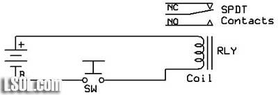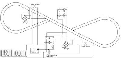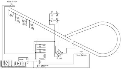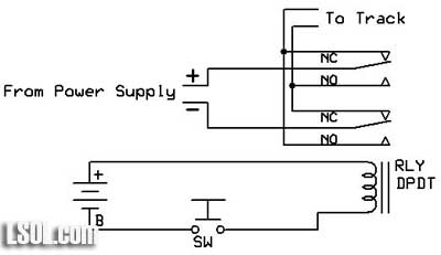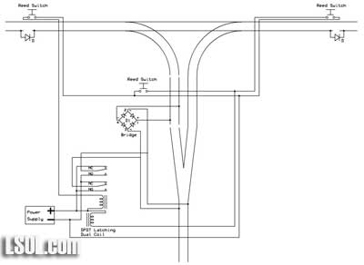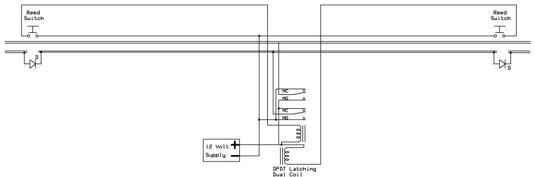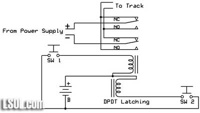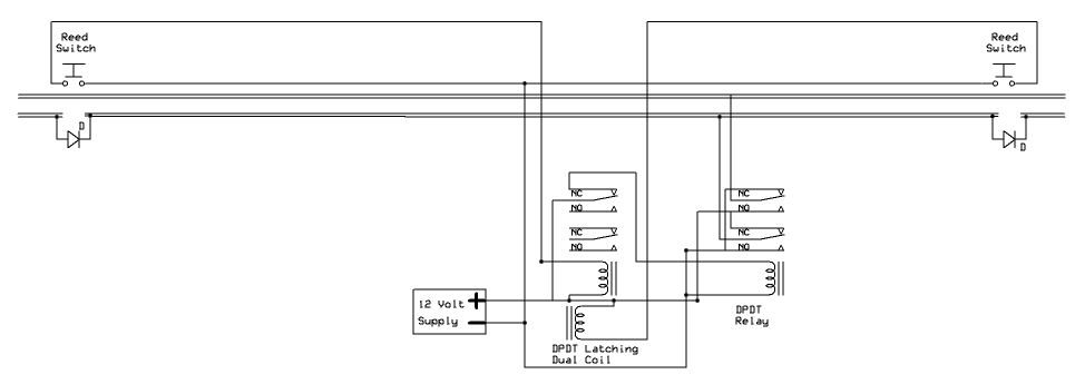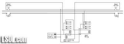 Model railroaders have used relays to control various devices on their layouts for years. In this article I would like to review how relays operate and explore an unusual type of relay that has some interesting capabilities. This single inexpensive device will allow you to automatically navigate a wye or a reverse loop with minimal effort. Relay Overview Traditional relays open or close a set of contacts when power is applied to a coil. The illustration below shows a basic SPDT (single pole double throw) relay. When pushbutton switch SW is pressed power flows from the battery to the relay's coil turning it into an electromagnet. The contacts move within the relay and the NC (normally closed) contacts open and the NO (normally open) contacts close. When SW is released power is removed from the coil, it loses its magnetic field and a spring returns the contacts to their original position. Whatever is connected to the contacts is turned on or off by pressing the button.  A relay with two sets of contacts is called a DPDT (double pole double throw) relay. Its contacts can be used to reverse the polarity of the DC power that is connected to a model railroad's track. When the relay is activated the direction of the train reverses. The two connections from the power supply go to the two common contacts on the relay. The NC connection from one set of contacts is connected to the NO on the other and the reverse is done with the other set. If you follow the way the wires connect through the relay contacts you can see how the polarity is reversed when the relay is activated. This photo shows several different types of single coil relays. The coil and contacts can be clearly seen in the relay in the upper right.  The only problem with using this type of relay to reverse your trains is that you have to hold the switch closed to keep the trains running in one direction and release the button to have it run in the other direction. It would be nice to be able to have the contacts "stick" in one position or the other. Enter the dual-coil latching relay! Dual-coil Latching Relay There is an unusual type of relay that is not commonly used in model railroad applications. It is no more difficult to use than normal relays and opens up some very interesting possibilities for controlling our trains. It is frequently a DPDT relay, just like the one above, but it has two coils, not just one. The contacts in the relay toggle one way or the other and stay there depending on which of the two coils was last energized. Note that I said "stay there" as this is the real magic of this relay. Once the contacts toggle in one direction or the other they latch and remain in that position until the other coil receives power. That allows us to use very simple NO (normally open) switches to toggle the relay's contacts from one setting to the other, changing the polarity on our track. Once the contacts latch in one direction or the other no power is needed to keep them there. The diagram below shows a dual-coil latching relay. Each of its coils is connected to a normally open (NO) pushbutton switch. When switch SW 1 is pressed for a moment the relay contacts latch in one direction and the track polarity has "+" on one rail and "-" on the other. When the other switch, SW 2, is pressed the contacts latch in the other direction and the track polarity is reversed. If there is a train on the track its direction reverses as well. You can think of the contacts as being a seesaw with a coil at each end. Once it is pulled in one direction it stays there until the other coil pulls it in the other direction.  The dual coil latching relay shown below is rated at 2 amps and fits into a standard 16 pin IC socket. You can see a representation of the two coils on the label. One goes between pins 1 and 16 and the other between pins 2 and 15. Note that these coils are polarity sensitive, that is it matters which end of the coil connects to positive and which connects to negative. The + and - symbols by the pin numbers indicate which pin connects to positive and which goes to negative.  Simple Auto-reverse Controller The DPDT dual-coil latching relay can be used to create what may be the simplest auto-reverse controller you can make. Auto-reverse controllers are frequently used to operate a trolley or other small engine on a single run of track. The trolley goes to one end, reverses and proceeds to the other end where the back & forth operation continues. To wire this controller replace the two push button switches in the diagram above with magnetic reed switches. (See Garden Railway Sensors - Part 1 for more information on reed switches) Then glue a magnet to the bottom of an engine or trolley so that it passes directly over each of the reed switches as it travels back and forth. It will trigger the appropriate coil to change the polarity as the train reaches the end of a point-to-point track. Place the reed switches between the rails a few inches before the diodes at either end of the track. The diodes are optional and are only there to stop the train should the reed switch fail to sense the magnet passing over it. Note that the diode's banded ends, the cathodes, face to the right at both ends of the near rail. This is the way they must be installed for G scale. If you want to try this with HO and smaller scale layouts you need to reverse both diodes. Click for Larger Image This circuit will automatically reverse the engine as it reaches the end of the track. Unfortunately that reversal will be abrupt and may be hard on the engine's gearing. The next circuit will help to make this less of a problem. Diodes Slow Things Down Gradually This version adds pairs of diodes to the ends of the point-to-point. These sets of diodes will gradually slow the train as it nears the end of the line. Most common diodes will drop a voltage going through them by approximately 0.7 volts. This circuit will first slow the train a bit by dropping the voltage by 0.7 vol