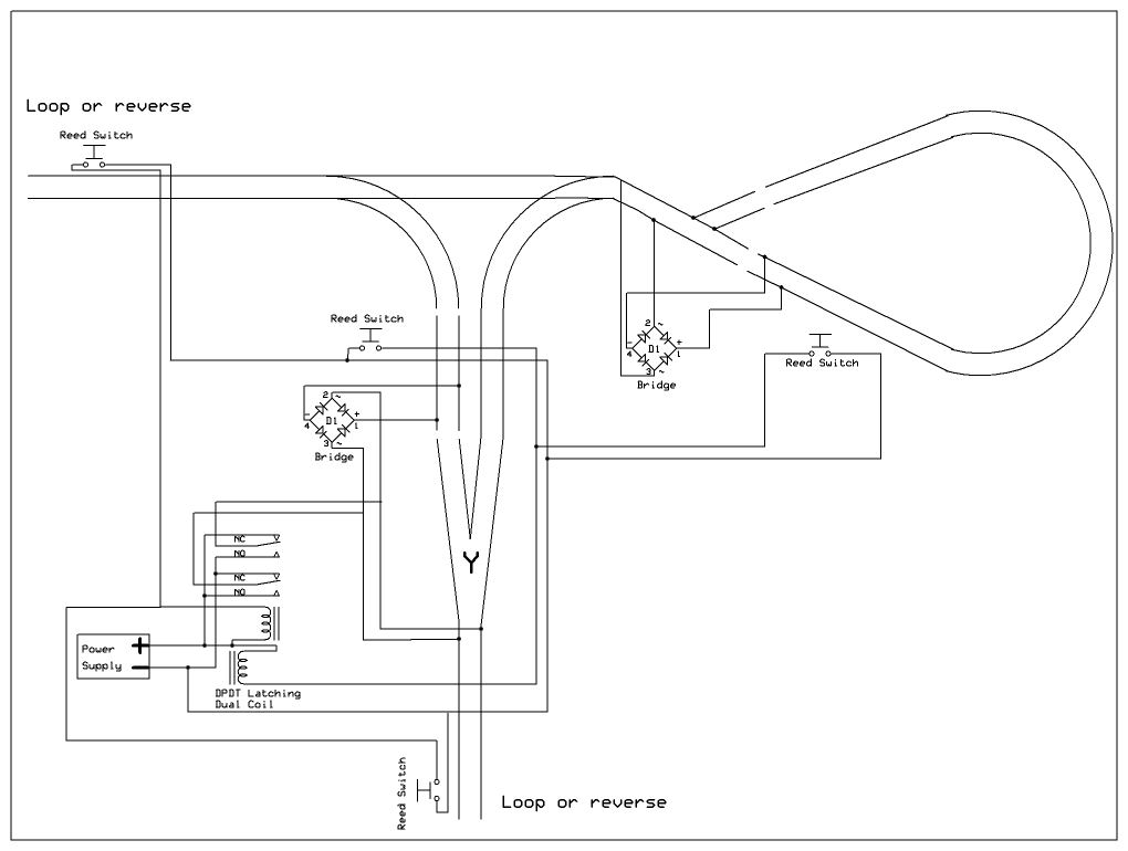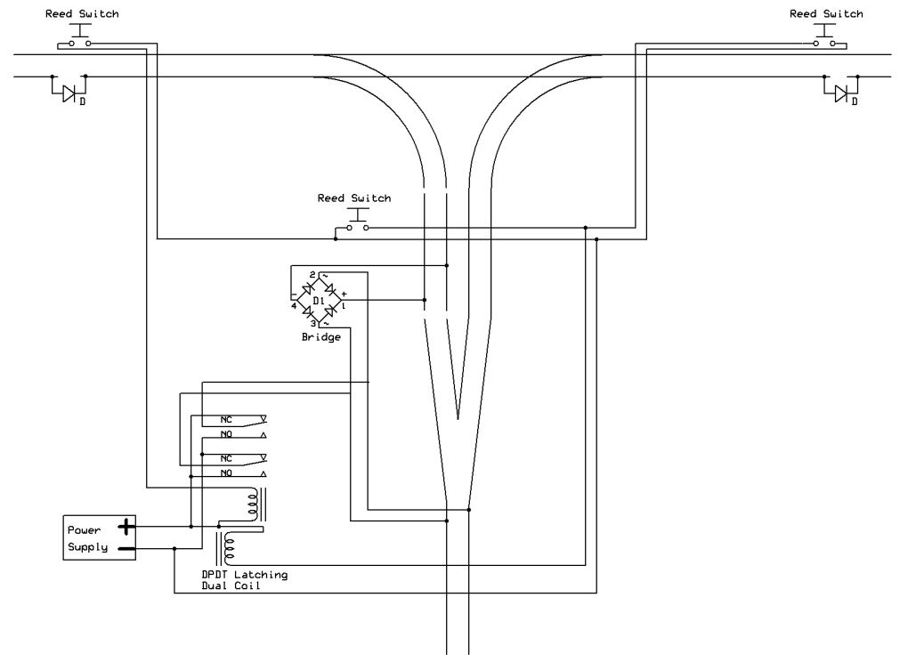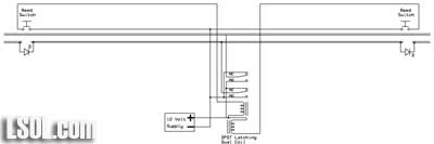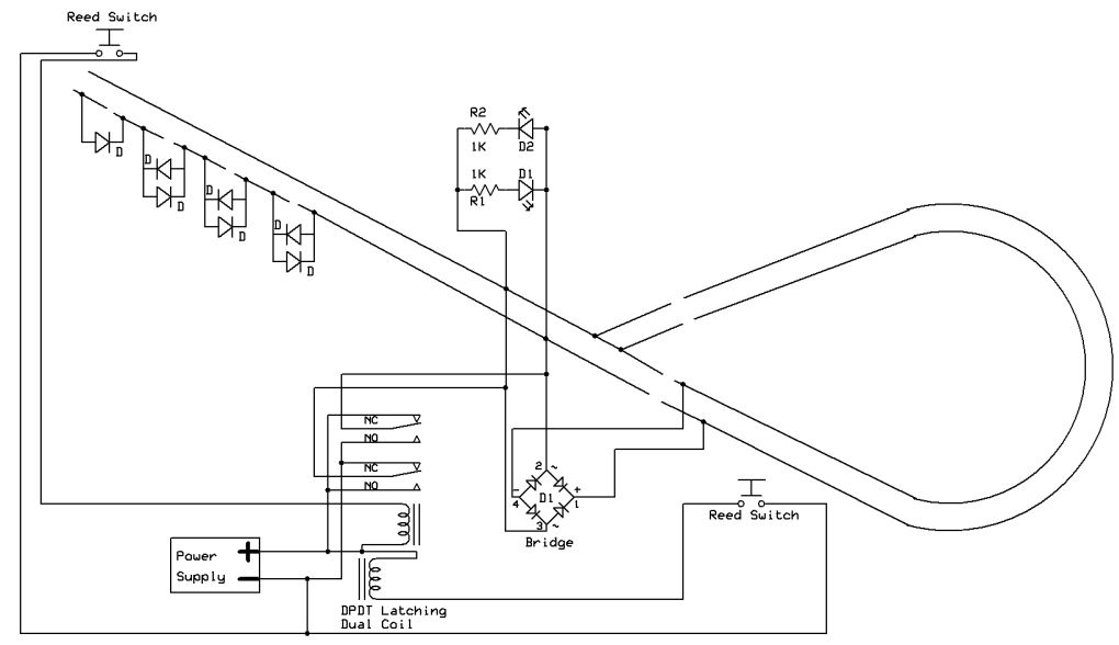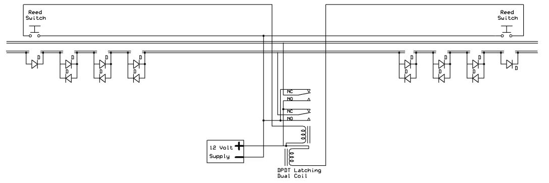 | Dave, the diagram with 2 reverse loops looks familiar. I remember when you came and saw my railroad and I showed you the relay controller for my 2 reverse loops you started telling me how the PIC could do this. At the time I couldn't find any latching relays so I worked out making a regular relay latch for me (too complex to explain here). I also used current draw in part of the loops as my "sensor" since I wasn't sure reed switches would survive outside, obviously they can. Its nice to see you come back to the tried and true relay, and my system has been running for 5 years with no problems yet. 5 years on relays should assure your readers that a system like this is durable and reliable. |