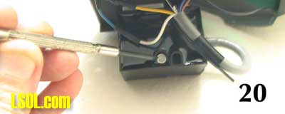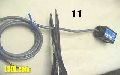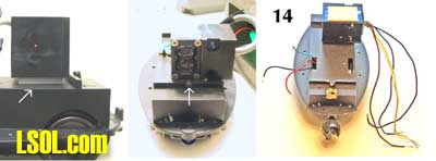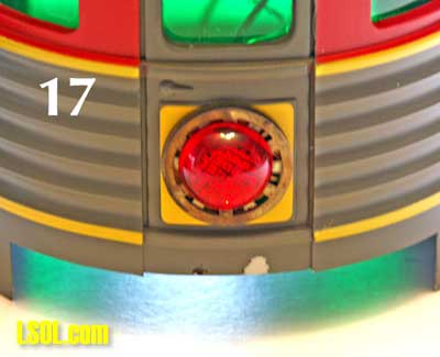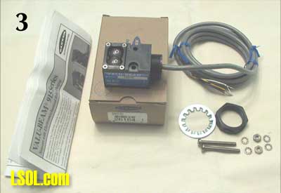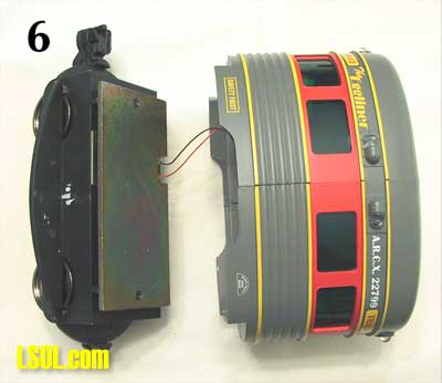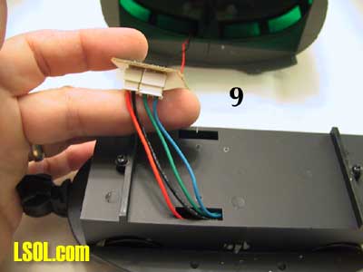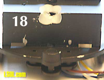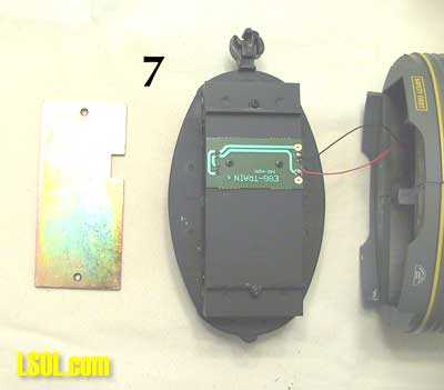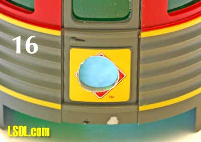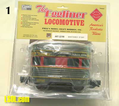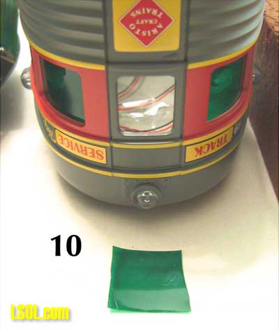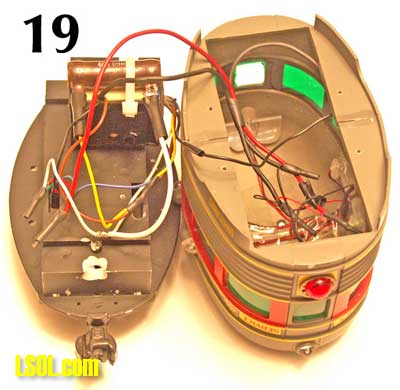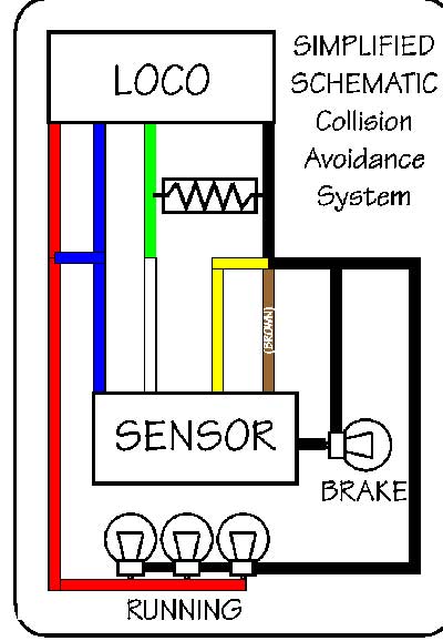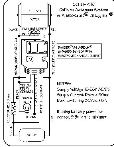 I have a lot of ideas for electronic gadgets which I would buy for my railroad, if they were available. Unfortunately my electronic knowledge is limited. Here is a simple implementation of one of these ideas. It requires only the most basic familiarity with electronics, wiring, soldering and testing. Imagine an analog layout where trains can be placed all over the tracks, with no worries about collisions. Fast and slow trains could co-exist. Robotic controls of the simplest form would replace expensive and complex systems. The resulting system would not be prototypical, but would be great fun and perfect for public displays or garden railroads.   For my proof of concept I combined an Aristo-Craft(tm) Eggliner (tm) locomotive, with a Banner (tm) Valu-Beam (tm) model SMW915D infrared, weatherproof, selfcontained sensor with electromechanical relay output. These modules would typically be found in industrial applications, such as monitoring a conveyor belt. The list price for these can be close to $100 but many different Valu-Beam sensors can be had on eBay in new condition for $10. This project involves mounting the sensor inside the Eggliner in such a way that it can look forward. When it approaches a slower train (most trains are slower) the sensor interrupts current to the motor until the slower train pulls ahead. To prevent the Eggliner from stopping completely when it sees another train, I implemented a suggestion from David Bodnar which allows the loco to run at half speed during these times. There are drawbacks to my design and they are all listed at the end of this article, but the project is easy and does work. Follow these instructions, referring to the illustration numbers in parentheses.  Remove and save 4 screws on bottom of Eggliner - (see arrows).  Remove and discard coupler on end shown. This will be the front of the loco. Re-attach the retaining plate for no particular reason. (You don't have to remove the coupler -- it just makes it easier to see which way the Eggliner is facing).  Wrestle the body away from the chassis.  Remove and discard the weight plate, exposing the 'circuit board' which, in fact, contains no electronics.  Remove and discard the cardboard floor in the Eggliner body.  Remove 2 screws holding the circuit board to the chassis. Withdraw the wiring harness, exposing the red, black, green and blue wires. Red and black are track power. Green and blue are the motor wires. Green is connected to black track power and blue to red track power. Just clip all the wires and discard the circuit board and the two connectors. At this point I recommend that you remove the motor block (2 screws) and the rear coupler as some of the following steps are easier without these components installed.  Remove the window at the front of the loco (the end with no coupler), from the inside, using your X-acto knife. The sensor will not work through a window.  Cut the sensor cable, leaving 6 inches.  Carefully hacksaw the threaded connector on the sensor. The sensor will not fit in the loco without this step.  Remove at least 2 inches of the cable outer sheath. If you wish, remove the entire sheath (my choice). Strip all wires.  Using THICK (1/8 inch or more) self-stick tape, mount sensor as shown, centering sensor windows over the screw - (see arrows). Now it is obvious why you hack-sawed the threads off the sensor . . . and the point of the thick tape is to elevate the sensor to align vertically with the Eggliner's front window. When you eventually replace the body it is a tight fit but will not be a problem if you have properly centered the sensor. At this point it is time to tackle the lighting of the body. There are 6 white running lights, no headlight, no directionality and no voltage regulation for these lights. To light the car you simply connect the red and black wires to track voltage. I chose to add a 'brake light', even though no train actually has one. When the sensor sees a train ahead, its SPDT relay turns OFF track current to the motor but the other half of the relay can turn ON an accessory at the same time. So I mounted a 12V red snap-in Radio Shack(tm) indicator lamp (part 272-332, $2.29/ pkg. of 2) on the rear of the Eggliner and wired it to the relay. Now it is obvious when the sensor has been activated, it makes it a little easier to adjust the sensitivity for smooth running and it looks great. You could wire anything you want into the relay at this point, including a sound module to make the sound of brakes.  First, drill a 1/2" hole (carefully, in many steps) at the location in the photo.  Attach either a few washers or an o-ring to the outside of the lamp. It is best to prevent the lamp from entering the loco's interior all the way, because there is an interference problem with the chassis.  Using your drill, grinder, file or soldering gun, make a notch in the chassis as shown to allow the lamp base to clear and the chassis to be fully inserted. This is the step where it is awkward to have the motor block or the rear coupler in place. Of course if you don't plan to install a 'brake light' there is no advantage to removing these 2 components. The lighting wires are too short and too flimsy, so solder some extensions to these wires. You may wish to slip a piece of heat shrink tubing over these 4 wires and fix them to the interior of the body, to cut down the clutter. You will probably be removing the body several times during debugging and adjustment.  You now have 4 wires from the Eggliner, 5 wires from the sensor and 4 wires from the body. One more component needs to be added and you can solder the whole mess together. As mentioned above, it is necessary to provide reduced voltage to the motor whenever the sensor detects a train ahead. I have installed a resistor which provides an alternate path for the current and is always 'on'. I wanted a resistor which would reduce the voltage by half, and settled on one of 43.5 Ohms. The higher the value of the resistor,