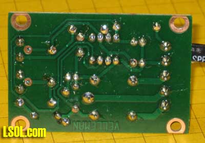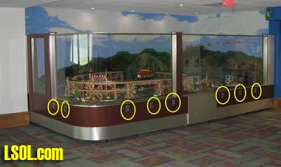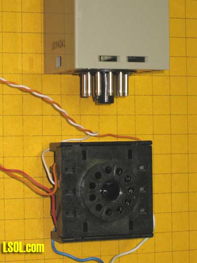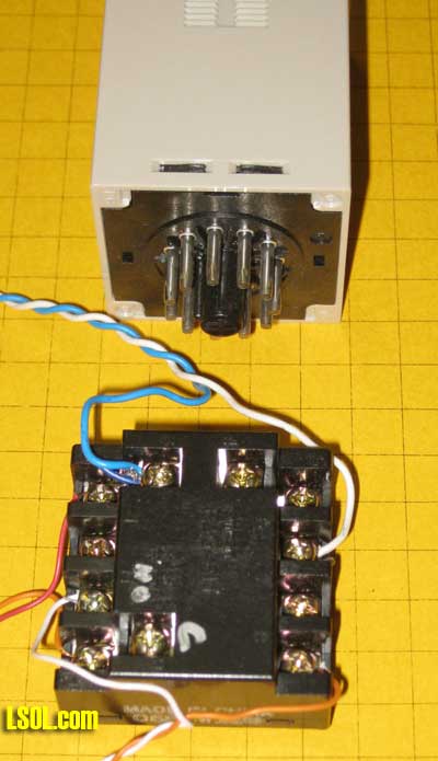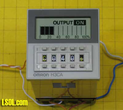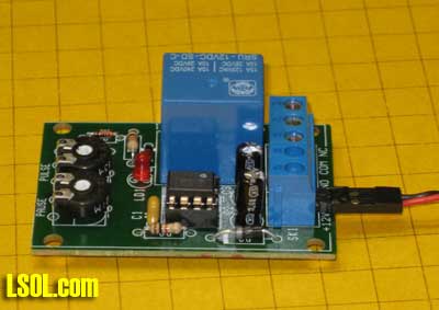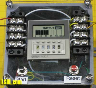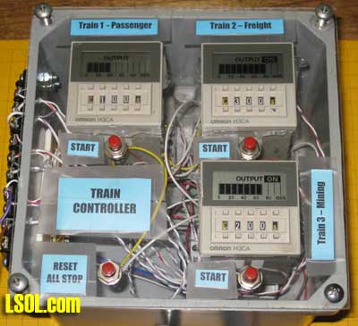 | Where and how would a hobbyist use a timer on a model railroad? Can a timer be customized to operate an animation in a specific way? Can a timer be used to automatically stop & start trains at a station? How can I use a timer to automate the operation of a train exhibit? What kind of timers are available that might be appropriate for model railroad use? I have a unique timing requirement and have not been able to find a commercial timer that can accommodate my needs. Can I build and program my own timer to solve this problem? These questions and more will be answered as we explore timers that can be used to control the behavior of our trains and to provide animation on our layouts. | Timers are used in many different model railroad applications. When the Pittsburgh Garden Railway Society installed a model train layout at Pittsburgh's Children's Hospital we employed nearly a dozen separate timers. The layout includes a number of animations, sound effects, a train and a trolley. Each of these are individually controlled by one of the eight pushbutton switches that are found on the base of the platform (see yellow circles below).  When a child presses the button for the main train line a station announcement is heard to say "Train leaving on track one - All Aboard!" and, after a brief pause, the locomotive and cars pull out of the station. The train does a few loops of the layout before coming to rest at the station. A timer is employed to trigger the station announcement and pause a few seconds before activating the train. Another timer determines how long the train circles the layout and plays a role in assuring that it stops at the station at the end of every trip. Similarly the Mr. Rogers trolley, which can be seen on the trestle in the photo, runs back and forth on its point-to-point track for a few minutes before a timer triggers the controller to return it to its primary station at the far end of the route. The animations and sound effects that are sprinkled throughout the layout run when the appropriate button is pressed and continue to operate for a length of time based on each timer's settings. There are many, many things that we can automate & animate on our railroads. A timer can be utilized with most of them to determine how long and in what manner they operate. A Very Basic Timer Kit A basic timer can be put together in an evening from a single chip, the 555 timer, a relay, and a few other components. Schematics abound for various 555 circuits and a number of kits are available, too. The photos below shows a 555 timer kit that is available from All Electronics for less than $10.00. All of the parts and the circuit board to build the timer are in the kit. In addition you need a soldering iron and a few simple tools..  Here is the finished unit. 12 volts goes into the circuit via the terminals on the right. The terminal block also has connections from the relay's contacts. The potentiometers (pots) that adjust the pause and pulse time are at the left. The 555 timer chip is the black device in the socket at the center of the board.  Soldering is done on the back of the board  When power is applied to this circuit the relay closes and stays closed for 0.5 to 5 seconds. After that time expires the relay opens its contacts and pauses for between 2.5 and 60 seconds after which the cycle repeats. The board has two potentiometers on it (the round black items at the bottom of the circuit board). One sets the amount of time that the relay (the large blue object) stays closed and the other determines how long the circuit pauses before the relay closes again. This continuously repeating cycle of open relay / closed relay may be appropriate for some model railroad operations but not all. Most applications need a timer controlled relay that closes when a switch is triggered with the relay staying closed for a set time before the it opens its contacts and awaits another switch closure. This is the type of timer that was used throughout the Children's Hospital layout. Industrial Timer: "Omron H3CA" Of course, we can go to the other extreme and purchase a commercial timer like the Search for Omron H3CA that sells for more than $100.00 at www.Digikey.com . This timer comes in a variety of versions and is frequently used for industrial controls. An Omron H3CA was used on the original Children's Hospital train layout. When a visitor pressed a button on the front of the layout it activated the timer, turning on the AC power to the train's power supply for 50 seconds. When the time expired the train stopped until the button was pressed again. Simple, but bullet-proof train control! The H3CA has a number of modes of operation that are identified by the first character in its control panel, a letter from A to H. For most applications modes "C" or "D" are appropriate. The other options are spelled out in great detail in Sorry: this link is no longer available from source. Seach for "the timer's datasheet". In mode "C" the timer is set to a time that can range from a fraction of a second to 9990 hours (about 416 days!). This is done by selecting a number from "000" to "999" and a Time Unit from 0.1 seconds to 10 hours. If you entered 040 for the time and "s" for the time unit the timer would activate for 40 seconds. If you changed the units to "m" it would activate for 40 minutes. Similarly if you chose "h" it would activate for 40 hours. The time unit options are detailed in the datasheet. When a pushbutton (or reed) switch connects the "start" terminal the timer's internal relay is closed and stays closed until the time that was selected expires. A graphic display shows the percentage of time remaining. When time is up the relay opens and stays open until the start button is hit again.. The relay is a SPDT unit that has three contacts: a common, a normally open and a normally closed. This photo shows the Omron timer set to mode "C" and to a time of "040" seconds. The display pictured here shows that