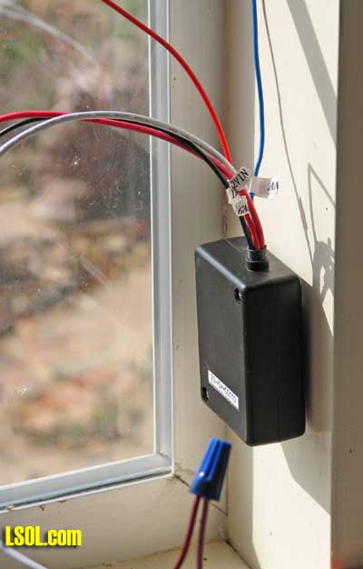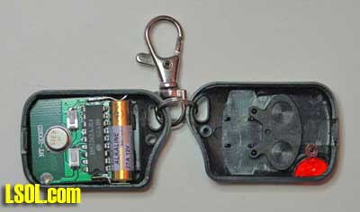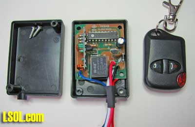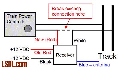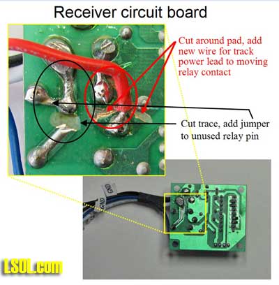 Have you ever wished you could quickly kill power to your trains but were too far away from the power controller? Or went to re-rail an engine but it kept trying to "run away" from you before you could get all the wheels back on the track? I wanted a way to kill track power remotely for the above reasons. I found it one day perusing the All Electronics catalog for $18.75. (Part # RC-10). This is a keychain remote control. You get two keychain transmitters with on and off buttons - like a remote car door lock/unlock - and a 12 VDC receiver. (Disclaimer - I have no connection to All Electronics other than being a frequent customer.)  Receiver and two remote transmitters as delivered I'm not sure what purpose they were made for, but a few simple changes make them ideal for our purposes. You can clip a transmitter to your belt when you operate, or stage the transmitters around the yard in convenient locations. I tested them at a range of at least 100' through my house but others report them working up to 300'. Operation As delivered, these units run off 12 VDC and switch that power on/off to a white wire. This power is turned on/off with the two buttons on either remote. On power up, the default condition is power off to this white wire. There are two changes we want to make to this operation. First, we want the default condition to be "power on" for our railroad. This makes it more convenient and provides for a "fail safe" condition, i.e. if it fails it won't prevent you from running trains. Second, we want to switch track power on/off, not the 12 volts that powers the receiver. Upon opening the receiver unit I found that both these changes could be made in a few minutes with no additional parts. Before we get started making the changes, there are a few things to cover. You need 12 volts DC from somewhere to power the receiver. Options are: possible accessory port on your track power supply, a 9 or 12 volt battery, a separate 12 volt DC "wall wart" (these are also available from All Electronics - part numbers change frequently just do a search). I happen to already have a "wall wart" unit providing 12 VDC to my railroad for sound units and other electronics around my Mystic Mountain Railroad. The relay in the receiver has contacts rated at 15 amps. If your train power supply puts out more than this under short-circuit conditions, or if you want to shut off more than one power source to your trains, you can just add a more powerful 12 volt relay outside. In this case you don't need to make any changes to the receiver. If you have a single supply of 15 amps or less, read on.  Receiver insides with transmitter Receiver changes If your soldering iron is hot, and you have a 2' piece of wire and a Dremel handy, you can do this in 5 minutes. Open the receiver box by removing two screws, and gently pull out the circuit board. There are two (redundant) black ground wires. Cut one off, pull it out of the black sleeving, and feed a new (recommend at least 2' long) piece of wire through the sleeving. This will carry your track power, so use #18 or larger. Turn over the circuit board and use a Dremel to cut a path through the copper/soldered traces as shown below. Brush the fine copper dust off the board with an old toothbrush or equivalent. Use an ohmmeter to make sure you've cut completely through and around the traces.  Receiver modifications The first change (in Red) separates the moving contact on the relay from the 12 VDC power for the receiver and adds the new wire to it which will connect to your track power supply. The second change (in Black) connects the white wire to the normally closed contact on the relay instead of the normally open one. This white wire will connect to your track. Re-assemble the circuit board into its box and wire into your track wiring as shown below. The blue wire on the receiver is the antenna, so route this wire to an unobstructed place, away from metal, and as straight and as high as possible. I mounted mine with Velcro next to a window in my train shed. Note: you don't want to try to "steal" 12 volts for the receiver from your track power since, if the tracks short out, the receiver will no longer work.  Wiring receiver to disable track power Note: since we're using a relay to shut off power, we don't care what kind of power you are using, pure DC, pulse power, even DCC. It doesn't matter which of the two wires to your track you break to connect this.  Receiver mounted next to window in train shed Transmitter changes To open the transmitter, remove the screw on backside, pry open, and slide off the back; you don't need to remove the wire loop holding the two halves together. Pick up the rubber buttons and reverse them (rotate 180 degrees). There's no pins to hold them, but once reassembled they'll be held in place. Now the "on" and "off" on the buttons will be correct - because of the changes you made to the receiver relay wiring above. While it's open, check the battery voltage - mine were OK, but there have been reports of weak batteries which reduce the range. It's a 12 volt, type "27A" battery, if you need to replace it. Reassembly is a little tricky since there's nothing to keep the buttons or the circuit board from falling out until the case is closed. Once closed, everything is held securely in place.  Transmitter inside before reversing rubber buttons on right Now when I operate trains I clip a transmitter to my belt loop and walk around my layout. If there's a derailment, I can quickly shut off the track power, re-rail the train, and turn power back on without having to race over to where my power supply is (inside the train shed). These units have 256 "channels" like your garage door opener, so multiple units can be made (and probably already are) independent of each other. If you put your imagination to work, you can find a lot of other uses for these nifty units. Like controlling a sound effects unit. Or throwing a key turnout. The receiver board is sma