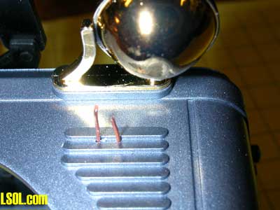To start installation of the two LEDs drill two very small holes between the first and second louver on each side of the body. In the photo below pieces of wire have been poked through the holes so that they show up more clearly. If you are wondering why I used two LEDs I decided that it would provide a more symmetrical look and the added LED would also produce a greater IR field for the detector to find!