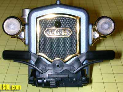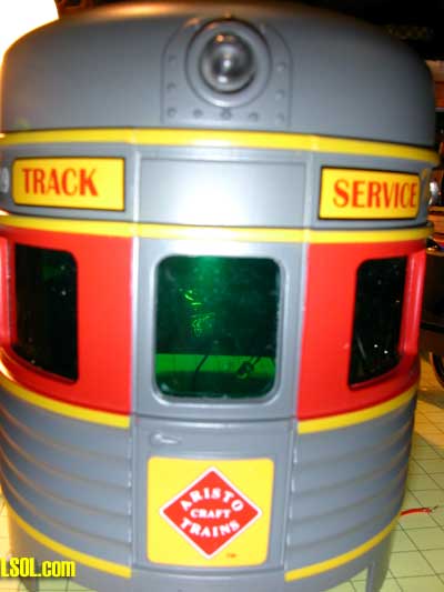 The picture below shows the front of the Eggliner. The infrared LED will be installed in place of he clear headlamp that can be seen at the top of the photo. The infrared detector will be mounted behind a hole that will be drilled in the Aristo Craft Trains label at the bottom of the door.