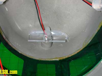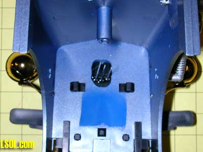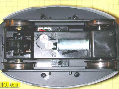 This inside view shows both devices in place. Be careful to add glue to act as a strain relief so that the components are not pulled loose when the Eggliner is apart. Also make sure that the wires attached to the IR detector are glued to one side or straight towards the top of the car so that the black Eggliner base will still fit into the body.