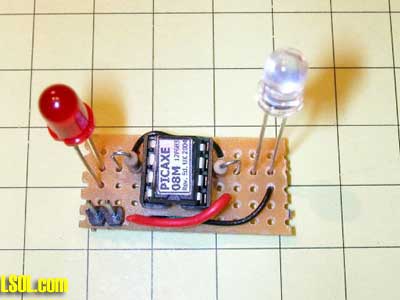 Here is the (extremely simple!) schematic. Note that there are no provisions for programming the Picaxe in this diagram. To keep things small they have been omitted. Just program the beacon's Picaxe using the other board and transfer it to the beacon board when done.