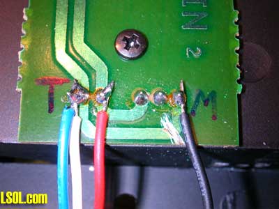 Solder 8" long wires to the track power contacts and to both sides of the cut trace. I soldered a red and a white wire to the two track power connections and a black and a blue wire to either side of the cut. Note that the easiest place to solder the blue wire is to the same contact to which the white wire is soldered.