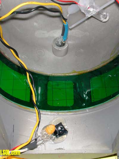 Once the plate is removed you will see a small green circuit board. The red and black wires on the left side connect to the interior lights on the Eggliner. Heat the solder joint where each of these wires connects to the circuit board and remove them. You must also remove the white piece of cardboard that is at the bottom of the Eggliner's body. Some I have worked with are taped in some are attached with hot melt glue.