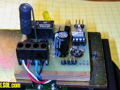 Reattach the metal plate routing the wires over the circuit board, under the metal plate and out through the notch in the metal plate. Next glue a small piece of insulating material (I used a thin 2"x2" piece of wood) to the metal plate and place the circuit board on top of it. Shorten the wires as needed and connect the wires as below. The red and white wires (from track power) go to the two connections on the left and the two from the motor to the two on the right. The large black object is a another type of resistor. This one is 18 ohms, a value that works well with the Eggliner. This power resistor is also placed so that it can easily dissipate heat.