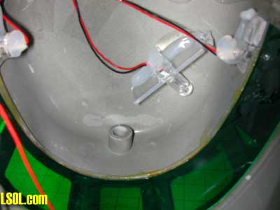Here the housing has been removed and glued out of the way at the top of the engine. The hole that remains is more than big enough for our IR LED. It can be glued in from the back with hot melt.