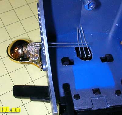 A 3/16" hole in the middle of the bottom of the door will accommodate the infrared detector which is glued in from the rear. Note that the part of the IR detector that you see in the picture is the small round lens that protrudes from the detector.