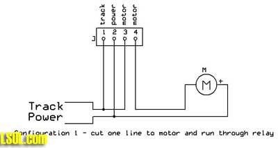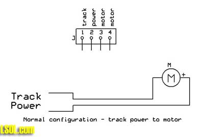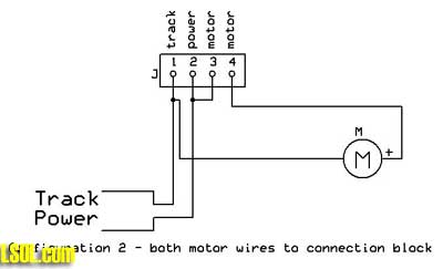 Connecting to Track Power and Motors Even thought every engine might appear to require a different method of accessing track power and the motor, there are really only two different techniques that we need to be concerned with. The simple engines that are ideal for this project usually have a small circuit board, like the Eggliner's, that give access to track power and the motor. Some engines, like the LGB rail truck, have a jumper block that can be removed to gain access to two track power leads and two motor leads. If your motor gets its track power directly from the track all you need to do is cut one of the motor wires and connect the ends to each of the right hand terminals that are labeled "M" for motor. Track power goes to the two terminals on the left. The diagram below shows this connection method which was used on the Eggliner.
