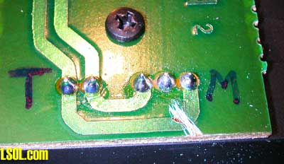 The contacts at the other end of the board connect the track power (the two contacts on the bottom) and motor power (the two outside contacts in the set of three at top). To give our circuit control over the motor one of these traces needs to be cut. Use a razor blade or Dremel to cut through the trace as you can see in the photo. Several cuts should insure that it is not longer connected. Note the "T" next to the track power contacts and the "M" next to the motor contacts.