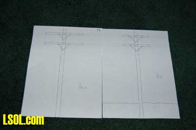 To begin the actual project, I spent some time measuring the pole in the picture above to determine actual measurements for the poles. I also measured some utility poles in the area to get a feel for the actual dimensions. From that I decided to use 10 ? 11 inch diameter poles for standard gauge and 6 -7 inch diameter poles for narrow gauge where smaller poles were normally used. I also researched several books for photos of poles on the New York Central to determine approximate dimensions for the poles found on that line in the 1950?s. What I found was that poles along the NYC came in a wide ranges of heights and arrangements. So I used one of the photos from the area of the NYC that I model and made some basic judgments about pole heights and crossbeam width. I discovered that line poles were typically 22 feet from the ground to the top of the pole by reading an article in this month?s Model Railroader by Paul Dolkos. In that article, Paul explains that distance between poles varied from 130 to 200 feet. For modeling, that distance would be too great, but it is useful information to help me determine how far apart to place my poles. Using all of this information, I then converted the measurements into the dimensions in 1/29 & 1/20.3 scales so that the poles would be correct for my indoor and outdoor railroads. I drew up a sketch of the poles on some graph paper to use as the model for the construction of my poles.
