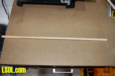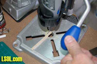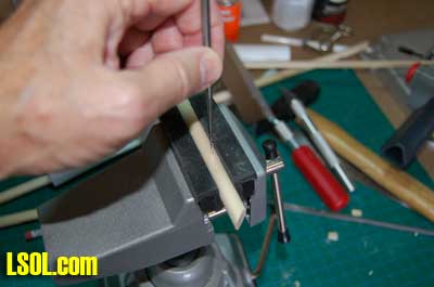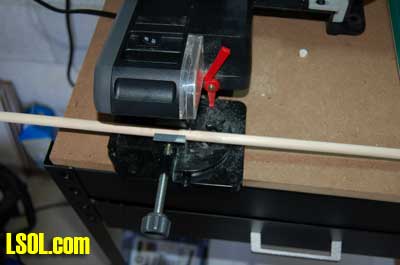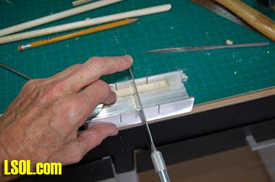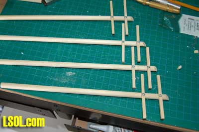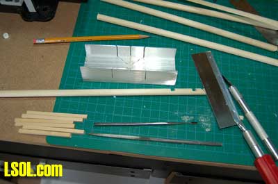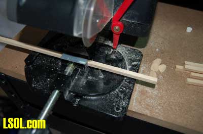 For ease of following I will describe the production of the 1/29-scale poles and then explain the differences for the 1/20.3 scale ones at the end of the article. Since the 3/8 ? dowels come in four-foot lengths, I first cut them into 12? lengths using my miniature cut-off saw. I then cut one end of each of the poles at a 45 degree angle.