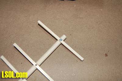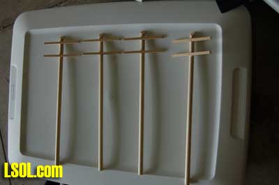 Using All-Purpose Poly Adhesive Clear Caulk, I fastened the crossarms to the poles and set them aside to dry.