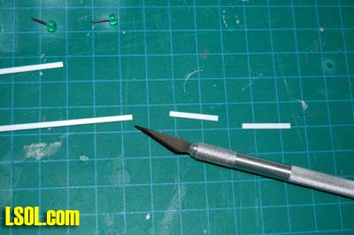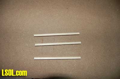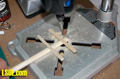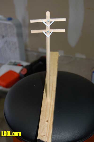 Next I cut the 3/8?X 3/8? basswood into 3 3/8? lengths (4 1/2? for the 1/20.3 poles) for the crossarms. I marked the center of the crossarms to line them up with the pole and also drilled holes for the 1/2? brads that would hold the insulators to the crossarm.
