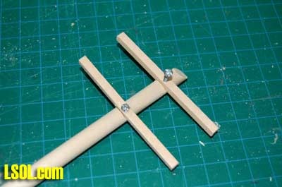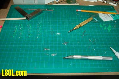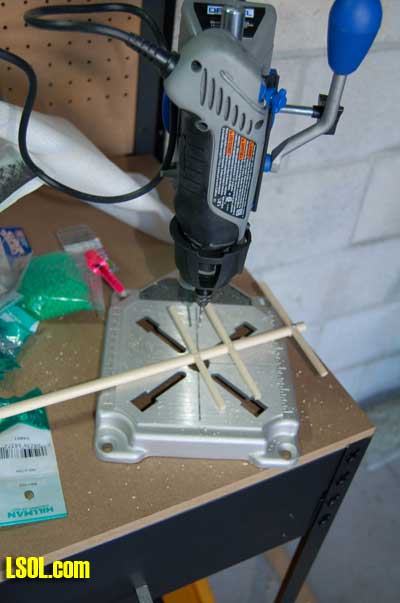 The next task was to glue the green beads that would serve as the insulators to the 1/2? brads using CA. This is a tedious and boring job. Twelve of these are required for each two-cross armed pole. If you put more crossarms on your poles the number goes up. I quickly found that the best way to do this was to dip the brad in the CA and then pick up the green bead with the brad. You need to be sure that the brad doesn?t extend beyond the top of the bead.