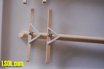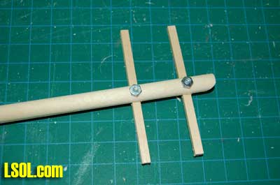 After letting the caulk dry for a couple of hours, I drilled holes in the crossarms and poles so that I could secure them with the 4-40 x 1/2 inch round headed bolts and nuts. I pushed the bolt through the hole and fastened the nut onto it. These bolts just fit through the pole and crossarm.