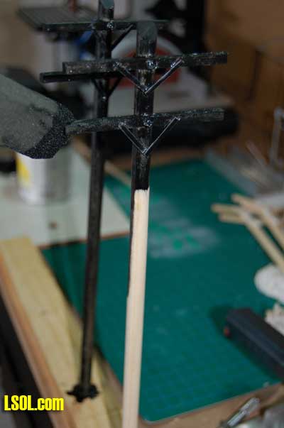 I needed to have support braces for the crossarms, so I cut some 1/32? x 3/32? styrene strips into short pieces using a hobby knife to make these braces. I glued them into place using the Clear Caulk and let them dry for a couple of hours.