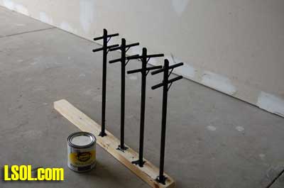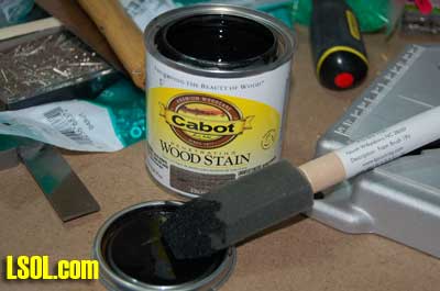 I drilled some 3/8? holes in an old scrap piece of wood to hold the poles so that I could stain them without getting my hands all messed up with the stain. I placed the poles in the holes and stained them with Cabot Wood Stain Ebony using a sponge brush. This leaves the poles with the right base color, but they are pretty shiny and need some weathering.
