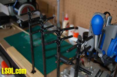 The poles look pretty authentic and now I need to start a production process to make about 40 of them for my indoor railroad and another 20 for my outdoor railroad. It takes some time to make the poles this way, but the end result is worth the effort. I have another five months down here in Florida without any trains to run, so you can see that I will stay busy for a while.