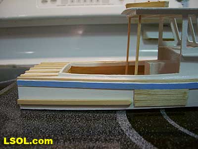 The most important part about this is to decide what you are going to do with the upper deck. As I look a little more at the black and white pictures in the plan, I noticed that the upper deck was stained and not painted. I decided to diverge right there. My deck halves were not pretty enough to stain. I did not think about it until writing this up that I could have planked it much like the lower deck. Then I could have stained it. Mine is just painted. Bottom line here is that the entire surface area of the boat needs to be completely covered with paint or stain or varnish etc., prior to continuing. This will be more evident as you see how I used this fact to create some eye candy trim.