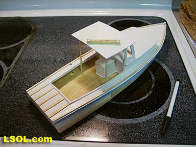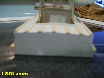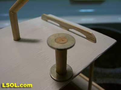 The toe rail that I made is out of 1/16” square balsa. It bends and twists very well. It is roughly placed on the top deck approximately 1/16” in from the outboard sides of the deck. In preparation, make sure that you carefully remove the loose “hair” from the square stock. You will not easily be able to work on this thing once it is glued into place unless your hands and eyes are far better than mine.