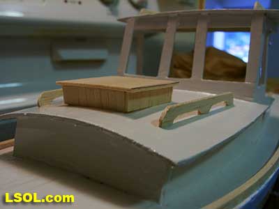 Then I made the box using pins to clamp them in place as needed. I am used to this process and can take some amount of practice to master. Then I cut the roof and glued it in place. Once dry, the hatch assembly is located and glued to the cabin roof.