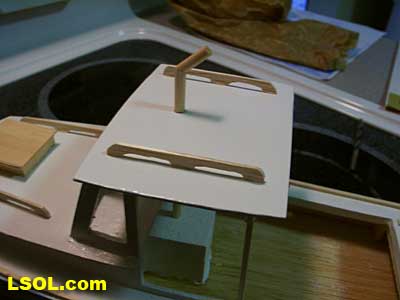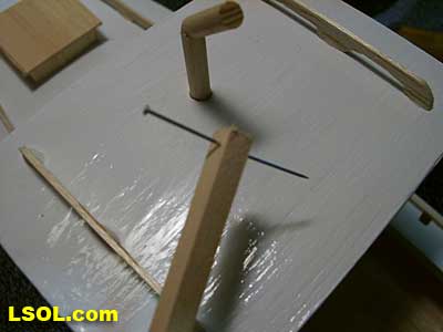 I measured the distance between the opening in the pilot shack and the pilot roof support pole. I then chose 1/16” x 1/8” flat balsa. I used three at the same length side by side.