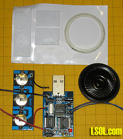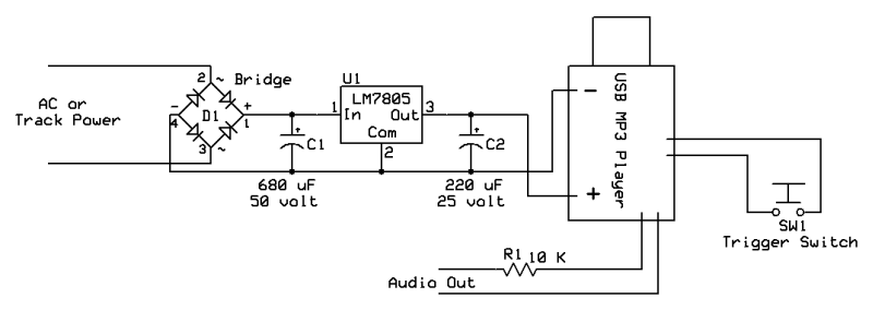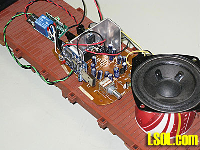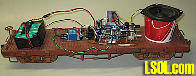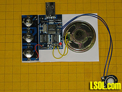 I have had an interest in sound recording / playback devices for many years and love to use them to add sound effects to trains and layout animations. I recently came across an unusual sound system that addresses many of the weaknesses and problems associated with other sound systems I have used. In my opinion it really hits a "home run" as it: is easy to use plugs directly into a computer's USB port for sound downloads utilizes the most common type of sound files, MP3's costs about $10.00 (should I have put that first??!!) can record up to 50 seconds of sound is easily connected to external speaker systems can easily be triggered by switches or Radio Control systems  Overview I discovered this MP3 player when I was doing research to develop the train layout at Pittsburgh's Children's Hospital. I needed to have a number of different sound effects that could be individually triggered and playing simultaneously throughout the display. I considered using a more sophisticated sound player but the costs added up quickly. That is when the $10.00 MP3 player described here caught my eye! The unit I have been working with is from an electronics distributor called Electronics 123. I have been ordering parts and various electronic devices from them for years and have written about another of their sound boards. See: Give Your Railroad a Voice - Part 2. The new sound board comes attached to a thin plastic sheet and is made up of four modules. A power supply section composed of three small AG10 cells (at the left in photo above) The electronics board in the center - note the built-in USB connector at the top of the board A 16 ohm speaker A small SPST momentary pushbutton switch at the end of a length of wire Just remove the small piece of clear plastic (shown below) from the switch and the unit is ready to go. Pressing the switch starts playback of a test sound clip that is installed at the factory.  Each of the modules is connected to the main electronics board with wires. The modules can be removed from the plastic sheet or left as they are originally set up.  If you decide to remove the speaker from the plastic sheet be very careful as it is easily damaged! Should you choose to rewire the board you will find that each solder connection is covered by a thin layer of clear adhesive that can gum up your soldering iron. It is best to scrape it off before soldering. If any of the glue remains just clean the iron's tip frequently and you can get through it rather easily. MP3 Sound Files Before installing and working with the software for the board you need to have an MP3 sound file ready to download. I described how one can locate, edit and save MP3 files in great detail in another article. Please see the very last section of Making your Railroad Sound Alive: MP3 Sound Systems (Part 1) for information on locating MP3 files on the Internet and downloading them and Making your Railroad Sound Alive: MP3 Sound Systems (Part 2) for a detailed description of how you can edit MP3 files using a very capable (and free!) audio editor. The article describes how to work with stereo sound files. There is no need to be concerned about stereo files as this sound unit has only one audio channel and the software automatically changes stereo files to monaural. The sound module can record either a 50 second MP3 sound file or a 25 second sound file. The difference is the quality of the sound that is recorded. The 50 second file mode records at a lower sample rate and has lower quality. The 25 second mode records at a higher sample rate and, as one would expect, has higher fidelity. For most of my animation sound effects 25 seconds is more than enough so I usually use the 25 second mode. If you don't need even 25 seconds of audio you can record whatever length you want and the unit will stop when the sound clip has been played. Software In order to get your own sounds into the module you need to download and install VDM Writer, a program that is available from the Electronics 123 web site. I have installed and tested it on Windows XP, Windows Vista and Windows 7 and find that it works on all of these versions of Windows. I do not think there is a MAC version. When you run VDM Writer this screen is displayed:  Click on "Open" and browse to the folder containing your MP3 file and load it into the program. The file's name will be displayed in the box at the top of VDM Writer.  Click "Play" to listen to the file. Click the + and - buttons on either side of Play to jump ahead or back 5, 10 or 20 seconds. The other options are "One-shot" or "Looping" playback. If you choose "One-shot" the sound will play once when the button is pressed. "Looping" will play the sound over and over until the button is pressed again. The "Playback will stop..." option determines if the sound will stop when you press the button while the sound is playing. If you don't check this box the sound will play to its completion once the button is pressed. Note that this is the case if "One-shot" is selected. If "Looping" is selected the sound will play over & over until the power is removed from the board or it is reprogrammed. I got stuck in this loop while experimenting and had to reload the sound file with the Playback box checked to get it to stop! When you choose "Record Normal Quality" you can use a sound file of up to 50 seconds duration. "Record High Quality" records up to 25 seconds. Connecting to External Speakers The speaker that is included is small and is not very loud. You are likely to need to connect the unit to an external amplifier and speaker system to give sufficient volume for use in a garden railroad environment. The most likely candidate for an external sound system is an old set of computer speakers. The good news is that most of us have a set of these left over from an old computer. They are also easy to connect to the MP3 sound player.  All of the speaker systems I have tried can be connected by wiring the input plug directly to the