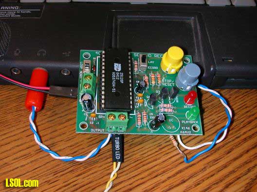 Here is a picture of the test setup using an old laptop as the sound source. In this picture the sound board is directly connected to the audio out jack on the laptop through a 10K resistor. You may notice that I did not use the green connection blocks for power and speaker but soldered pins to the bottom of the board so that I could use the quick plug in connectors from an old computer, thus the label on one plug in the picture "TURBO LED"!