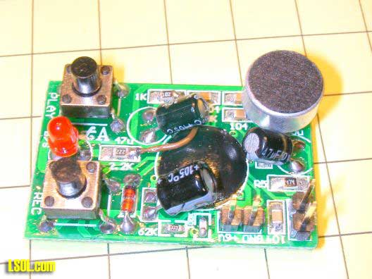 120 Second, Multi-Message Board The company that manufactures the amplifier boards that were used in this project, www.Qkits.com, also has a number of sound and voice recording kits. To me, the most intriguing board utilizes a sound recording chip that can record up to 120 seconds of sound. That in itself is impressive but the most interesting part of the board is that many short messages can be recorded on the chip and played back individually. This would allow you, for example, to record 10 messages each with a duration of 12 seconds and play them in sequence, one at a time, each time the play switch is activated.