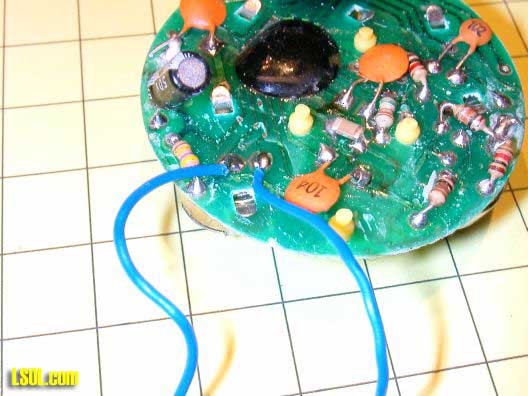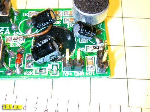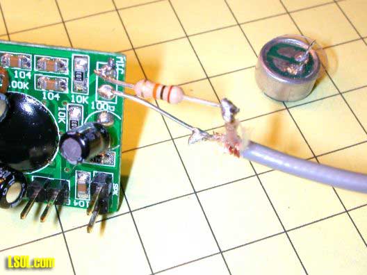 As in the taking dog bone module the sound can be improved by connecting directly to the computer's speaker output. Remove the microphone and connect a 10,000 ohm resistor as in the photo below. Make sure you connect the resistor to the pad shown as its location does matter!