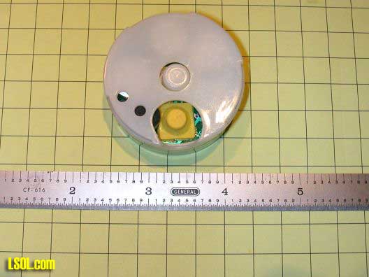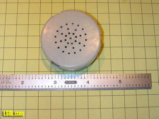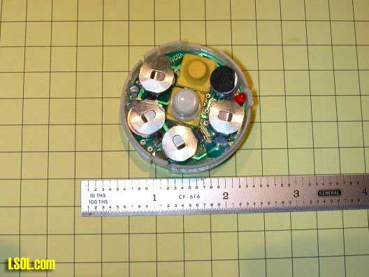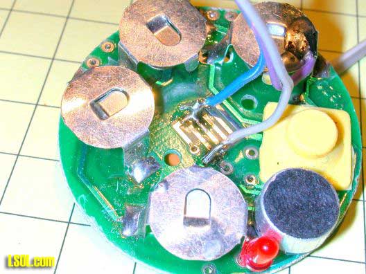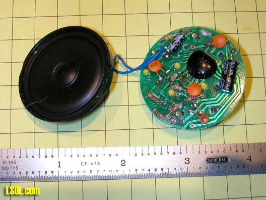 When the top of the nylon case is removed by releasing 3 clips the inside of the board is revealed. The white center button is pressed to play a recorded sound. The yellow button (which is normally recessed in the case) is held to record up to 10 seconds of sound. The small red LED (at the far right edge of the case) lights when you are recording and goes out when the 10 seconds capacity of the chip is used up. The four silver areas are holders for watch batteries.