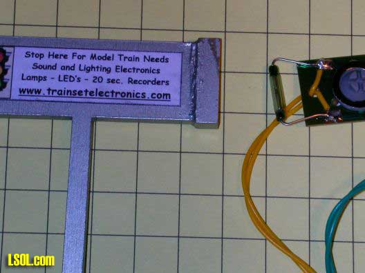 Included with the RSM and RSMO modules is a clever sign, pictured below, that has a powerful magnet glued to its side. The intent of this design is to have the sign mounted near the edge of the track so that a boxcar, containing the sound module and reed switch, passes near enough to the sign to be triggered each time the train passes. This is a nice alternative to putting reed switches on the bottom of cars and burying magnets in ballast. I found the magnet attached to the sign to be strong enough to trigger the reed switch at a distance of at least 1".