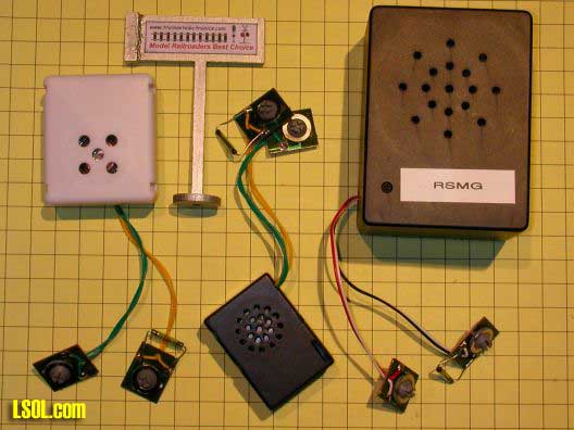 The models pictured above were not specifically designed for G scale or outdoor use. The volume is more than sufficient for indoor layouts but is likely to be lost in the out of doors. As I was completing this article I received the latest product from the folks at http://trainelectronics.com/, RSMG, designed for use in G scale train systems. It is considerable larger then the HO and O scale units as you can see in this picture.