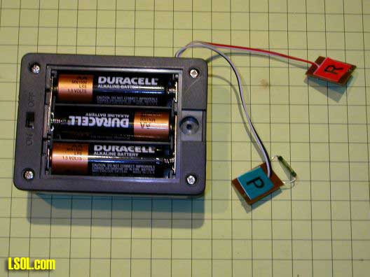 There are two sets of contact pins that come off of the board. Two are for the speaker and two for power. Take great care in hooking up the power connections as reversing them, even for an instant, is sure to kill the circuit. In the photo below the two pins at the far right are for the speaker and the two to their left are for power. The left power pin is for +6 volts and the right for ground. If you need plugs to fit over these pins they are identical to the pins inside of most IBM compatible computers. Before you pitch an old computer harvest the wires that go to the reset switch, power switch and front panel LEDs as they will fit here perfectly.