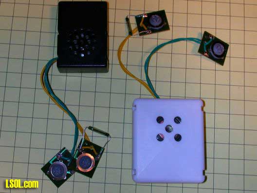 This scenario of operation is possible without any modifications to the kit. If a simple microprocessor (see: LSOL article "Robot Trains in the Garden") is added the microprocessor can pick one of the recorded messages at random rather than having them always play in sequence. This does complicate things a bit and random repetition could easily be simulated by recording the above 5 messages over and over in random order until the entire 120 second capacity of the board is filled. Since each of these messages takes only a few seconds of recording time I think that solution might be the simplest!