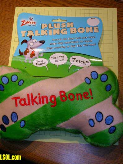 A few months ago I was looking over a pet supply catalog and found an intriguing item. It was a stuffed toy bone for dogs that contained a sound recording module that could record up to 10 seconds of your voice so that it would be replayed whenever the dog chewed the toy.