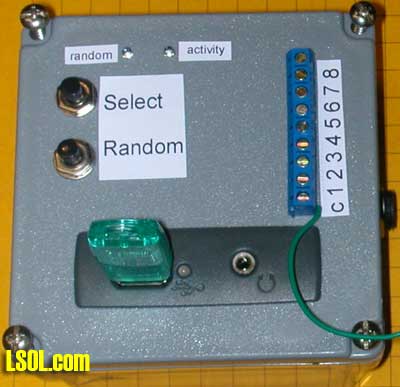 The two buttons in the upper left are for changing the random / non-random setting for each activation switch. The two LEDs at the top, labeled "random" and "activity" help with the programming. The random LED is green when lit and the activity one is blue.