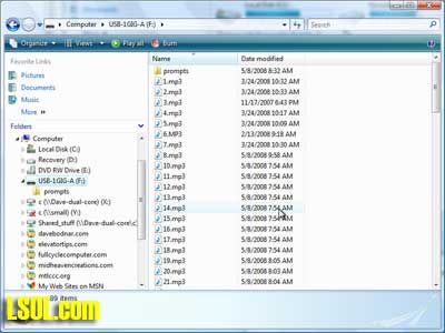 The USB drive contains all of the sound files that the MP3 Sound Controller will use. When you double click on F: (or G:) you see a partial list of files like the one below. Scroll down the right hand panel to see the whole list.