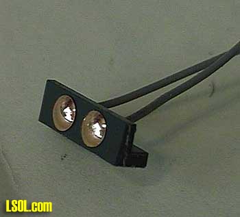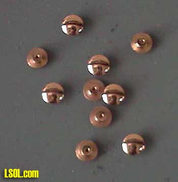 "Hmmm... OK, I can work with these." These were sent to me some years ago by a fellow LSOL'er. The "contacts" have a round head of about 9/64" diameter and a small shaft that is just under a 5/64" diameter. (A small brass screw with the threads cut down could serve the same purpose.) A 3/16" x 3/16" piece of Plastruct "L" serves as a base to hold two of these contacts. The length of the "L" was cut to match the width of the Kadee. Two 5/64" holes are drilled in the Plastruct approximately 11/64" apart. This dimension need not be exact and the idea here is to get the heads close together, but far enough so that they don't touch. A length of light, flexible wire is soldered to each of the two shaft's. The wire is passed through the holes in the Plastruct and the contact/wire assemblies are cemented to the "L" using cyanoacrylate adhesive (CA).