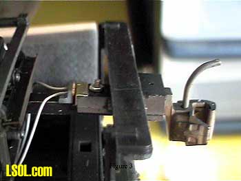 (A regular piece of 3/16" wide brass could also be used here, but the "L" is "self-aligning" and provides a better grip to the Kadee due to its increased surface area.) The Kadee is mounted in typical fashion, but using a small machine screw and nut instead of the provided sheet metal screw. The screw allows the Kadee to slide back and forth, slightly, along the coupler mounting shaft. The screw should not be so tight as to bind the coupler in place and a drop of CA on the threads allows for this play and keeps the nut from backing out of the screw. In my case, the Shay had ripped this coupler mounting shaft in two and a new shaft was fabricated out of a piece of rectangular, hollow brass stock that is 3/16" x 5/16". The 5/16" dimension also matches the slot in the Kadee and minor sanding of the brass allows the coupler to slide back and forth freely. (The stock Bachmann stand-off would also allow for this same movement.) The Kadee is pulled to its extended position and the Plastruct "L" (with contacts) is CA'ed to the mounting shaft just behind the coupler. The Plastruct "L" needs to be positioned parallel to the brass "L"mounted on the coupler and close enough such that when the coupler slides forward, the brass "L" on the Kadee shorts the two contacts mounted to the Plastruct (Figure 3). (A Kadee shim may be used as a distance gauge and to ensure alignment.) That's the system plain and simple. It's far more rugged than the original micro switch and works like a charm.